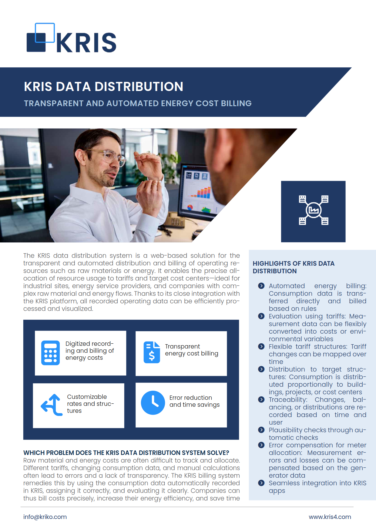 The KRIS data distribution system is a web-based solution for the transparent and automated distribution and billing of operating resources such as raw materials or energy. It enables the precise allocation of resource usage to tariffs and target cost centers—ideal for industrial sites, energy service providers, and companies with complex raw material and energy flows.