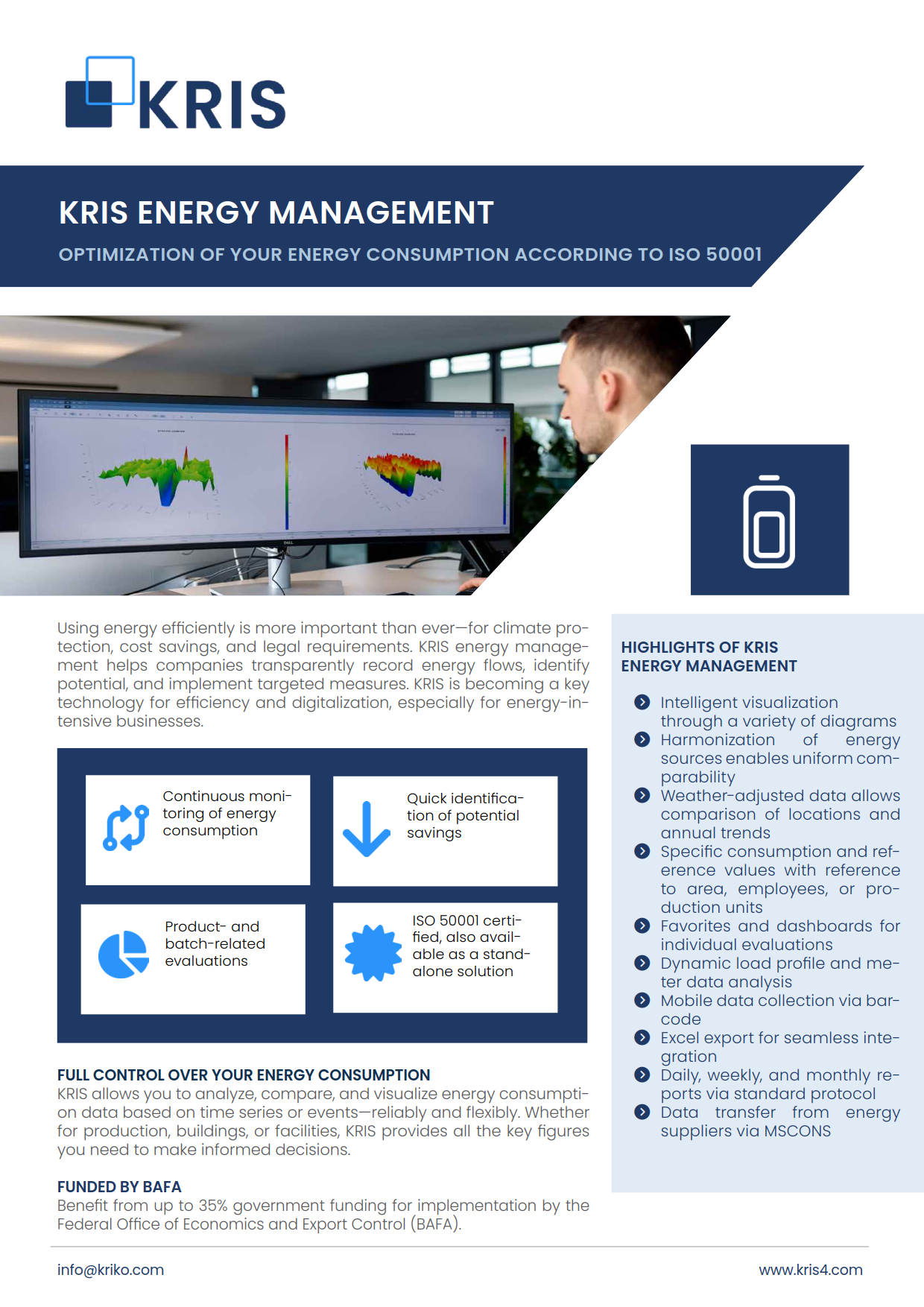 The economical use of energy is increasingly becoming a focus for companies. Efficient energy management not only makes an important contribution to climate protection, but also strengthens competitiveness. KRIS offers you everything you need to display energy flows in an up-to-date, clear and transparent manner.