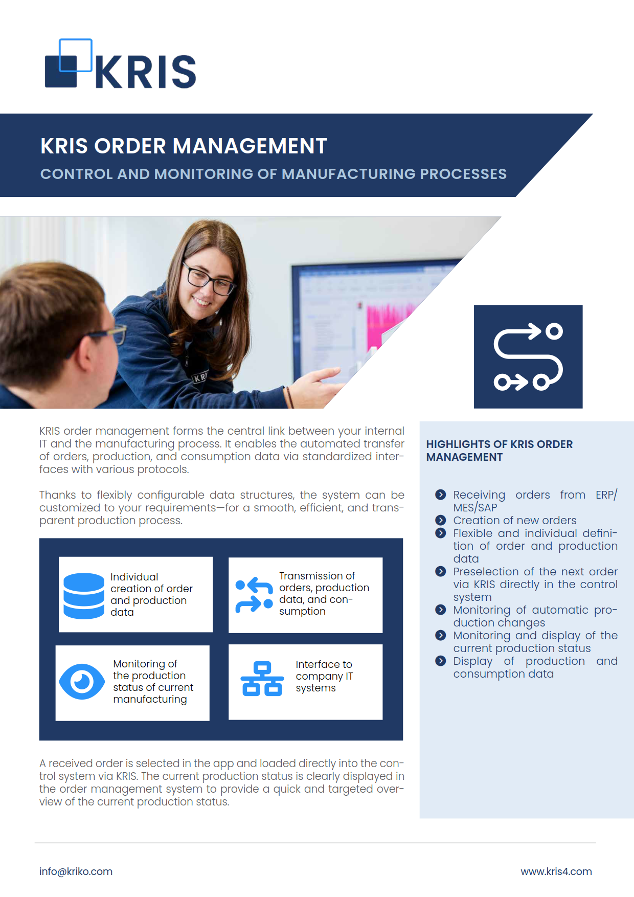 KRIS order management forms the central link between your internal IT and the manufacturing process. It enables the automated transfer of orders, production, and consumption data via standardized interfaces with various protocols.