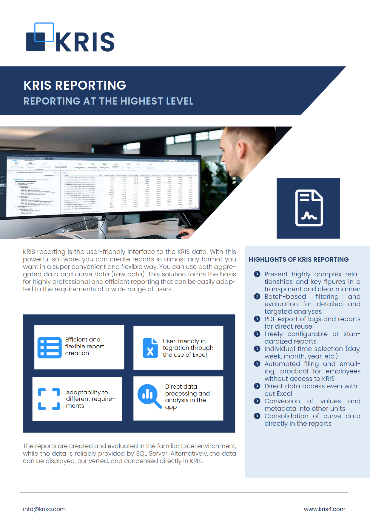KRIS reporting is the user-friendly interface to the KRIS data. With this powerful software, you can create reports in almost any format you want in a super convenient and flexible way. You can use both aggregated data and curve data (raw data). This solution forms the basis for highly professional and efficient reporting that can be easily adapted to the requirements of a wide range of users.