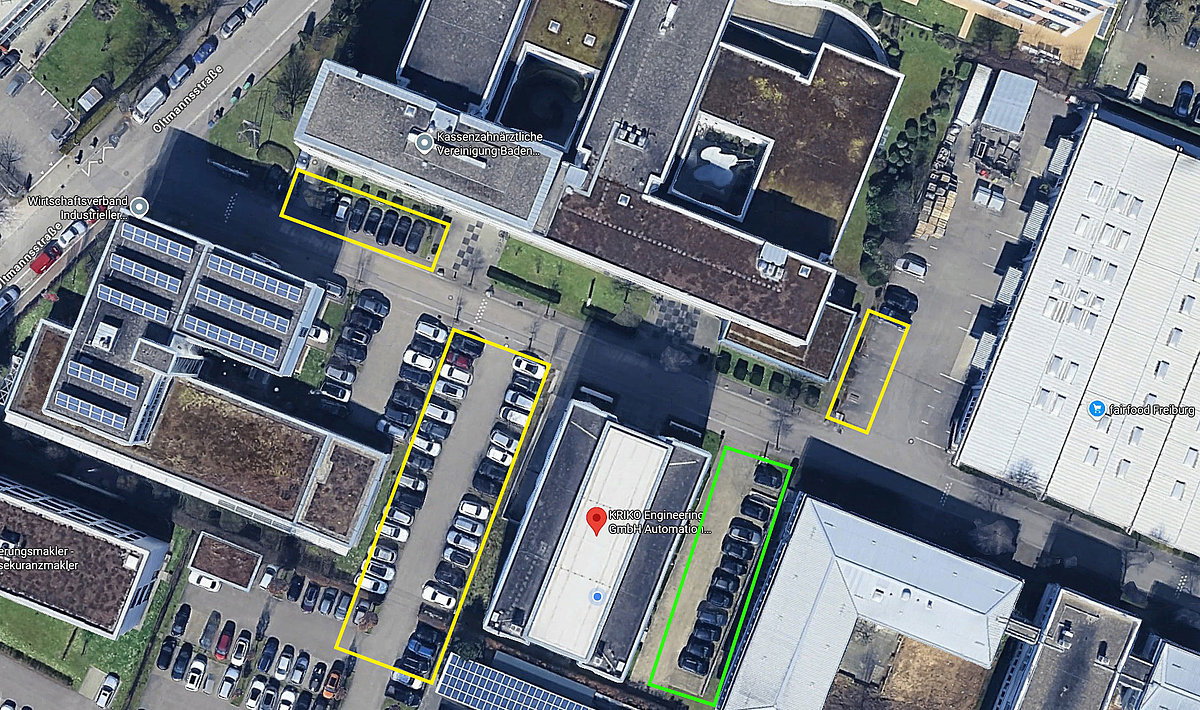 die Besucherparkplätze links neben dem KRIKO Gebäude (grün)