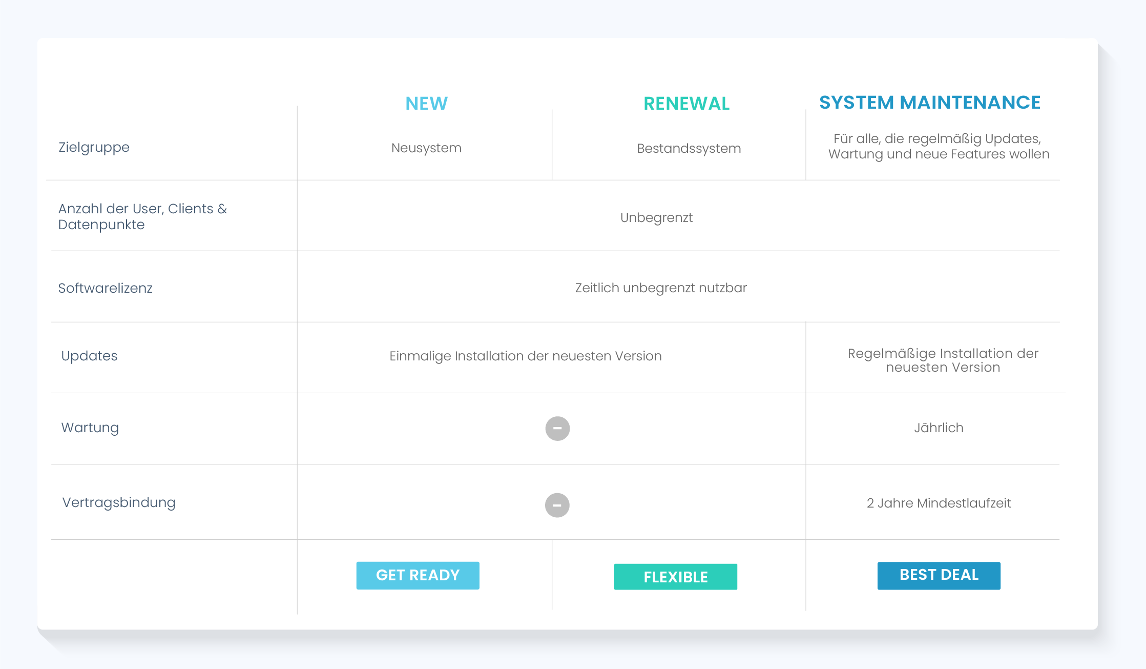 Im Rahmen unseres Modells geht die Lizenz während der Laufzeit in Ihr Eigentum über. Auch nach Vertragsende bleibt sie dauerhaft nutzbar – ohne Einschränkungen. Die Mindestlaufzeit beträgt 2 Jahre.